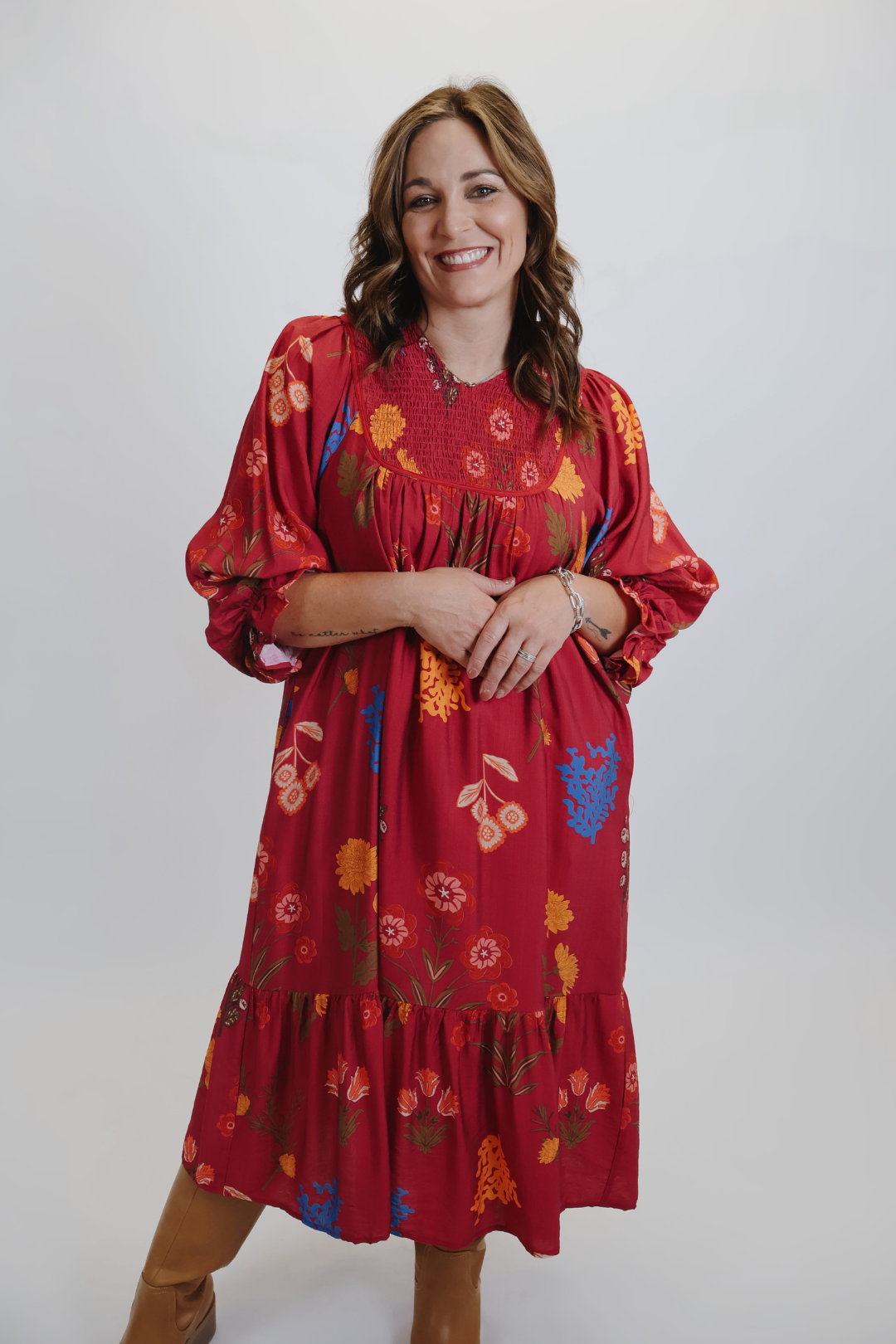 Enamórate del encanto natural de nuestro Vestido Largo Fruncido Autumn Blossom. Este vestido, con preciosos detalles, presenta un canesú fruncido y un escote redondo que le aporta textura, mientras que su silueta relajada y fluida te mantiene cómoda y elegante. El estampado floral se extiende sobre la tela rica y cálida, ideal para la temporada. Las mangas largas con puños elásticos con volantes y un bajo con volantes escalonados le aportan el toque perfecto de feminidad. Totalmente forrado para un ajuste suave y acabado con detalles de ribete en contraste que lo hacen realmente destacar.