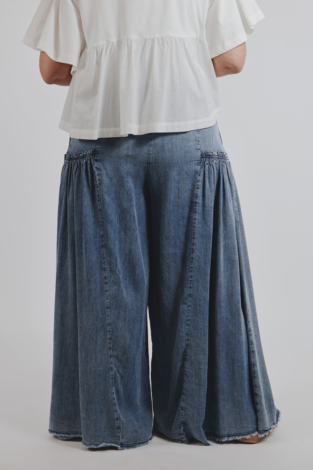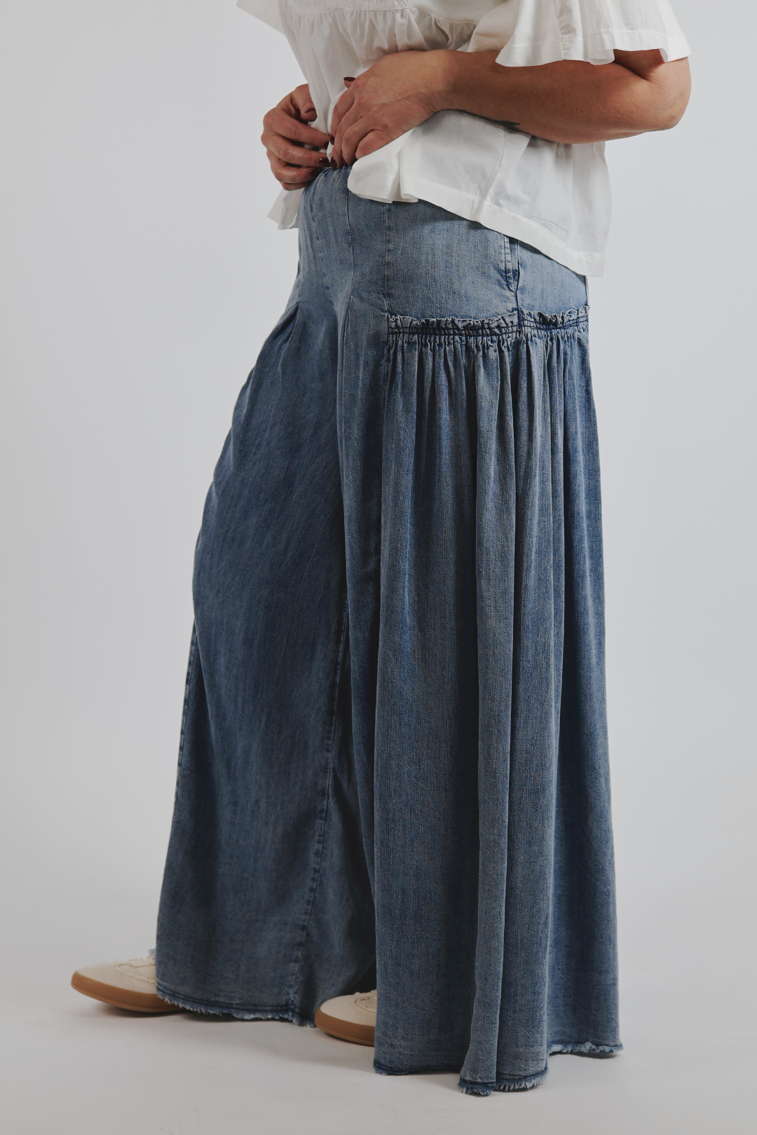 Descubre el par suave y fluido que tu armario ha estado esperando: los Dreamy Pantalones Palazzo Chambray. Confeccionados en chambray ligero 100 % Tencel, estas bellezas de pierna ancha ofrecen un ajuste ligero y ultracómodo que se adapta a tus movimientos. La cinturilla elástica te permite moverte con naturalidad, mientras que los volantes en los paneles laterales añaden un toque dulce de encanto bohemio.