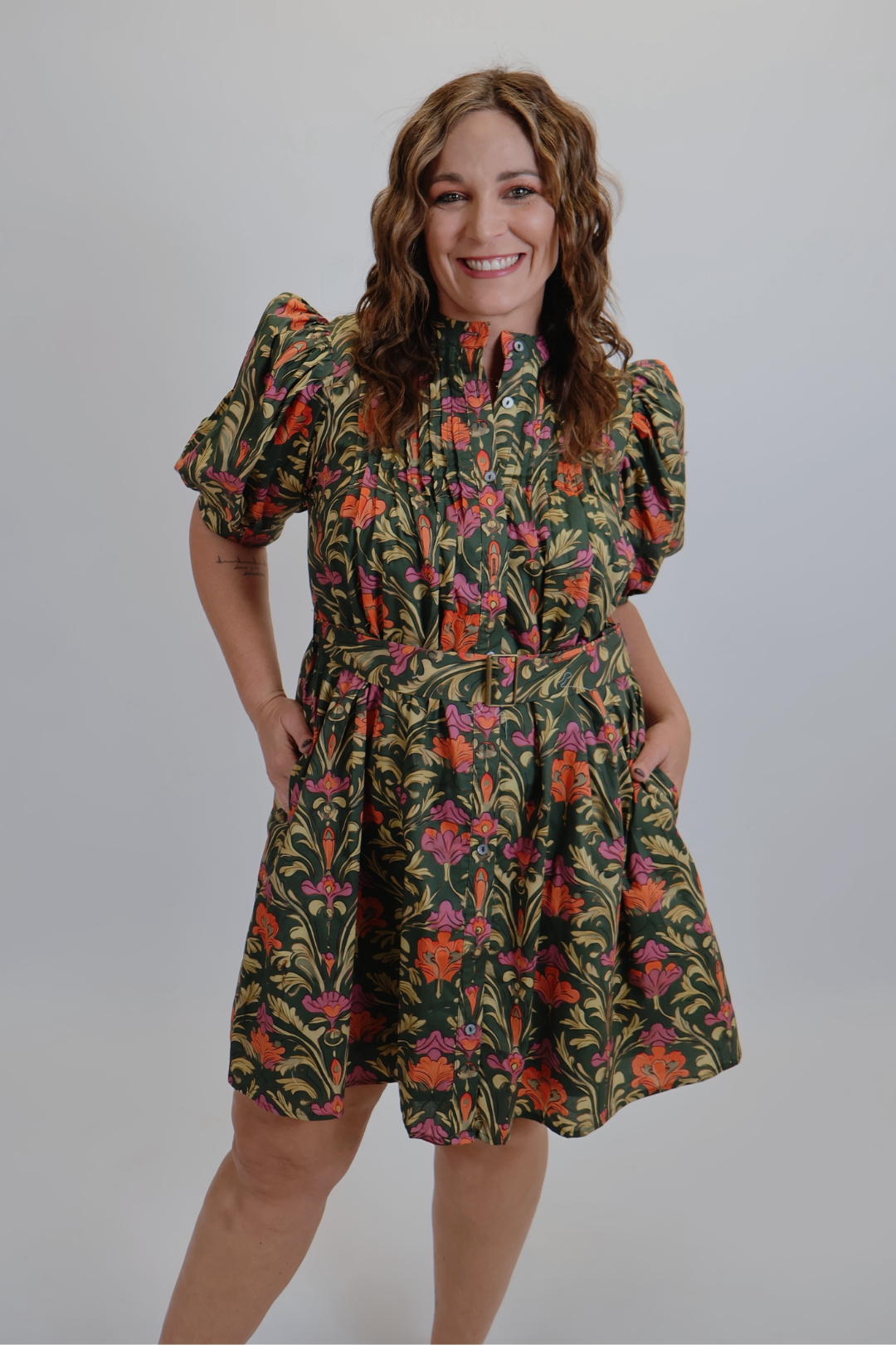 Acapara todas las miradas con el minivestido con cinturón Garden Charm, una prenda impactante que rebosa de vibrantes estampados botánicos. Diseñado con mangas abullonadas y delicados detalles de pinzas en la parte delantera, este minivestido irradia encanto femenino con un toque de sofisticación. El cinturón con hebilla a juego ciñe la cintura para una silueta favorecedora, mientras que el cierre frontal con botones y los bolsillos laterales le aportan funcionalidad. Confeccionado en 100 % algodón, este vestido forrado, opaco y ligero es perfecto para usar durante todo el día, desde un brunch hasta un paseo nocturno.