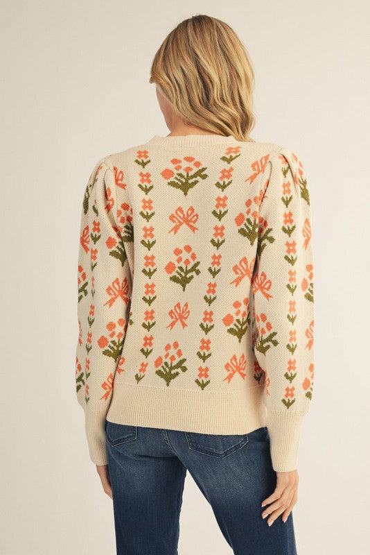 Dale un toque vintage a tu armario de invierno con nuestro suéter Meadow Blooms de mangas abullonadas. Este acogedor top de punto luce un encantador estampado floral en suaves tonos coral y oliva sobre un fondo crema, dándole un aire atemporal y femenino. Las mangas largas abullonadas y los sutiles detalles de pliegues en los hombros le dan una silueta romántica, mientras que los puños y el dobladillo acanalados mantienen una estructura perfecta.