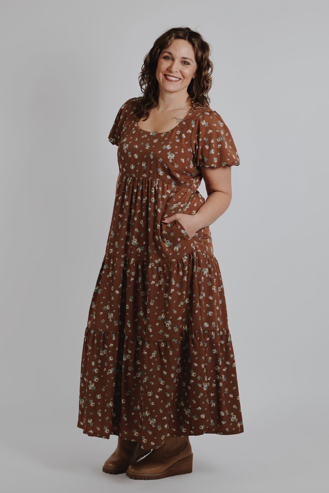 Romántico y atemporal, el vestido midi Marigold combina a la perfección comodidad y encanto. Diseñado con suaves mangas abullonadas, una silueta escalonada y un delicado estampado floral, este vestido favorece cualquier figura, manteniendo una feminidad natural. La espalda fruncida garantiza un ajuste cómodo, mientras que los lazos ajustables añaden un toque de elegancia. Completa con bolsillos laterales y un forro completo, es una opción fácil para citas de brunch, bodas o paseos de fin de semana por el mercado de agricultores.