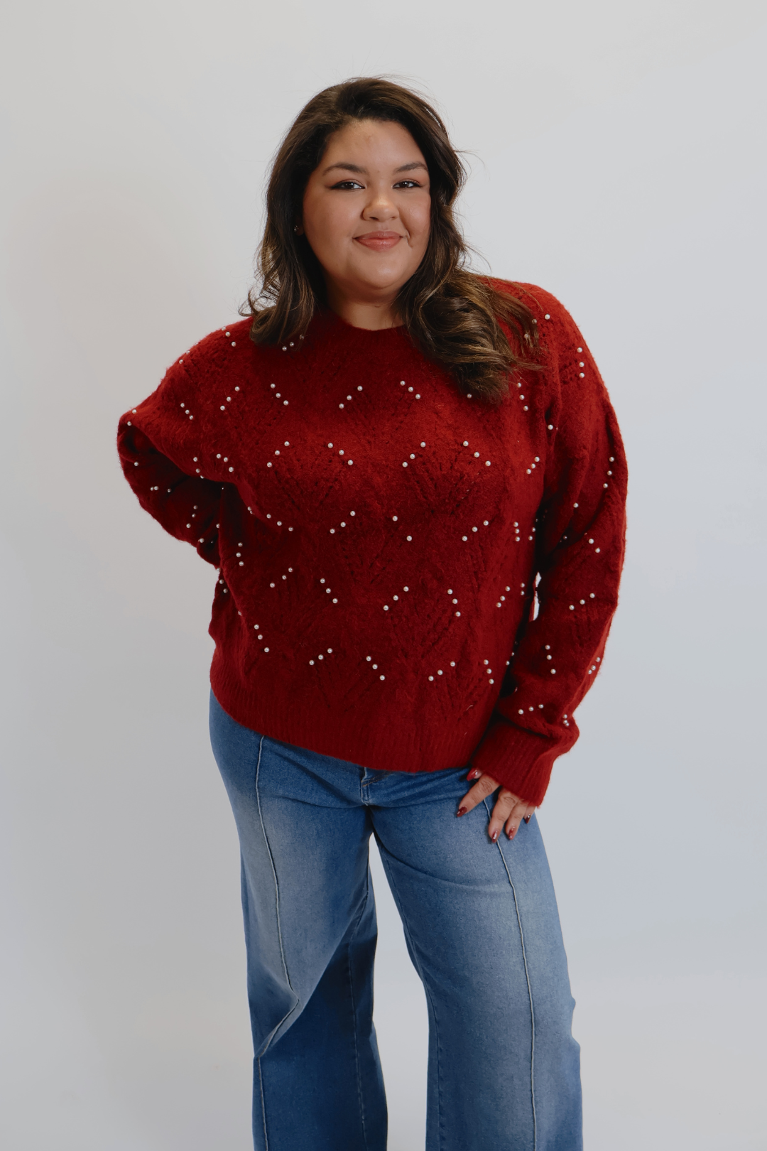 Eleva tu guardarropa para el frío con el Suéter Merlot Pearl Luxe, un tejido rico y elegante que combina suavidad con un sutil glamour. Este suéter color vino intenso presenta un hermoso patrón de rombos, delicadamente adornado con perlas que le dan un toque de sofisticación atemporal. Confeccionada con una tela acogedora y texturizada, y terminada con un cuello redondo clásico, puños acanalados y una silueta relajada, es la pieza perfecta para reuniones navideñas, noches de citas o simplemente para darle un toque más elegante a tus vaqueros de diario.