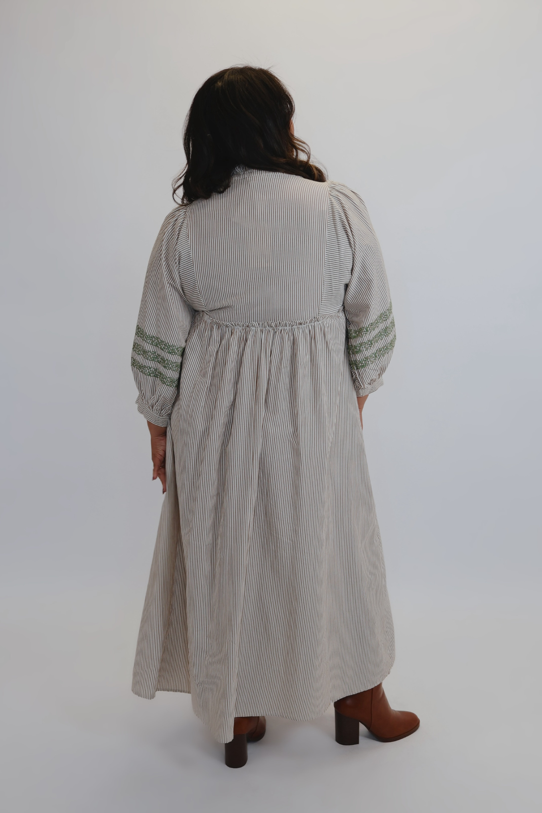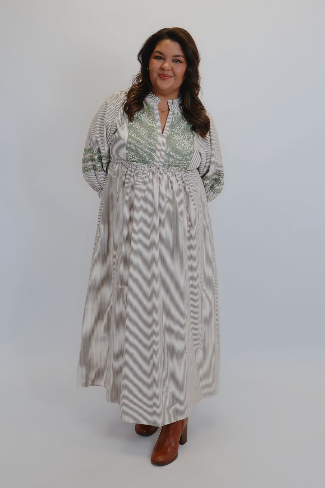 Romántico y bohemio, nuestro vestido midi bordado Prairie Bloom combina un encanto atemporal con la comodidad moderna. Con mangas 3/4 abullonadas, un escote con suaves volantes y un intrincado bordado en el corpiño y las mangas, este vestido midi a rayas se caracteriza por sus detalles cuidados. Su silueta relajada y tejido ligero la hacen perfecta para todo, desde brunchs hasta mercados de otoño.