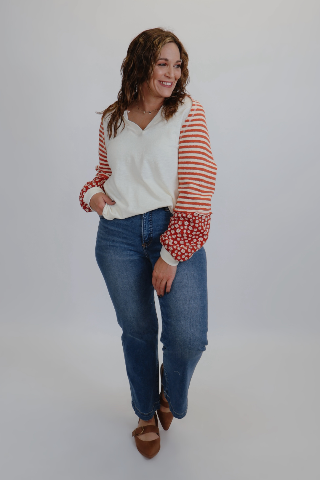 El top de punto Daisy Fields ofrece una alegre combinación de estampados y texturas para un look divertido y relajado. Con un cuerpo de punto suave y mangas abullonadas con rayas y flores en contraste, este top oversize combina comodidad informal con un toque de fantasía. El escote dividido, los detalles de los bordes sin rematar y el dobladillo redondo le añaden un encanto relajado, perfecto para un estilo informal y cotidiano.