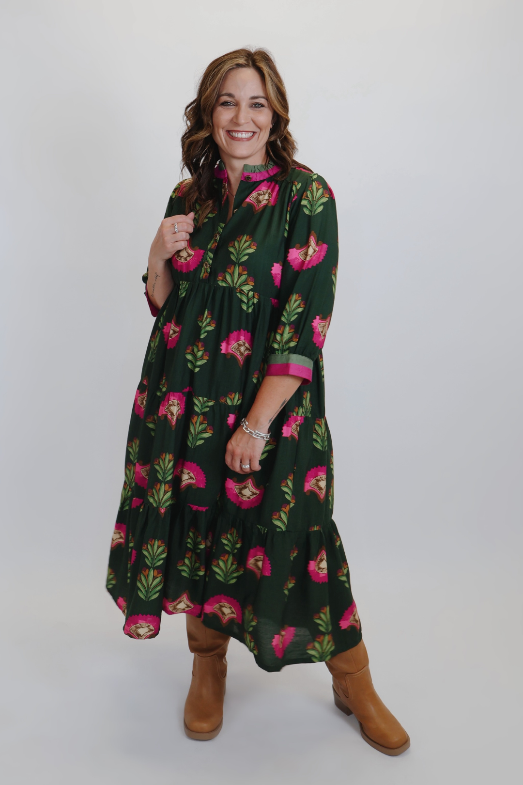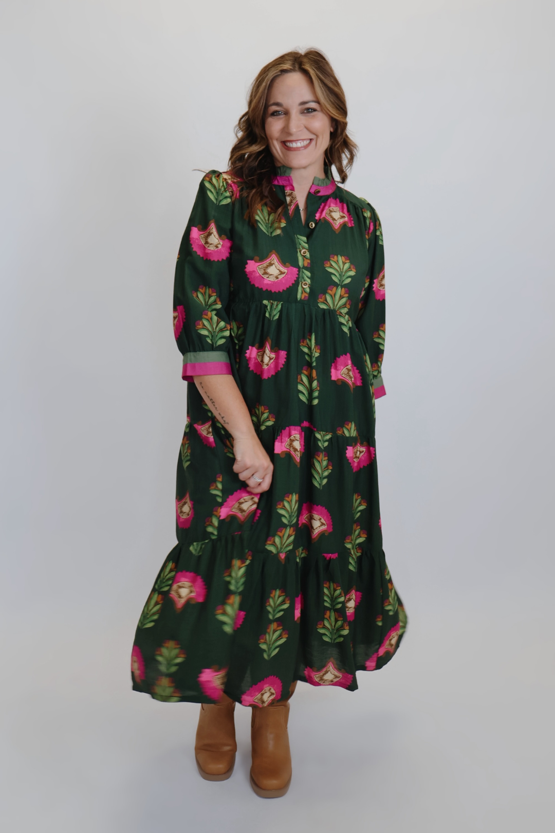Confeccionado en una suave y transpirable mezcla de rayón y nailon, el vestido presenta una favorecedora silueta escalonada de corte A que fluye con gracia a cada paso. El escote redondo está acentuado con un sutil volante, y la parte delantera con botones dorados le aporta un delicado toque de sofisticación. Con mangas 3/4 y un corte holgado, es perfecto para llevar en capas o solo en cualquier temporada.